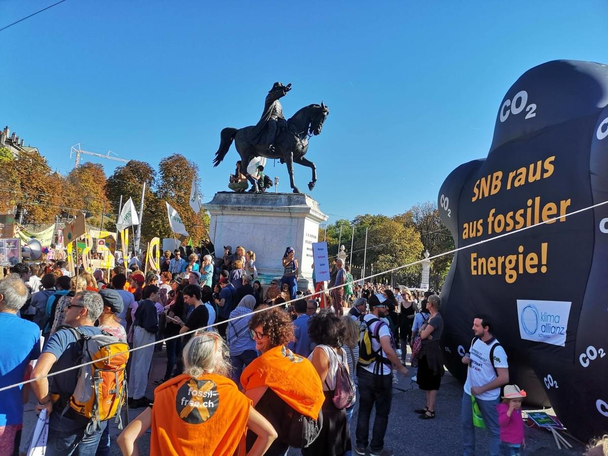 Die Demonstranten verurteilen auch die Geschäfte des Schweizer Finanzsektors mit fossilen Brennstoffen. Schweizer Finanzakteure, also die Banken, Versicherungen und Pensionskassen verantworten weltweit mehr als 20 Mal so viele Treibhausgasemissionen wie die Haushalte und Unternehmen in der Schweiz zusammen. So finanzieren beispielsweise die Credit Suisse und die Nationalbank Unternehmen, die mit den klimaschädlichsten fossilen Brennstoffen wie Kohle und Teersande geschäften.