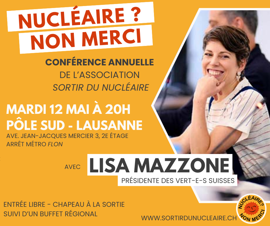 Dans ce contexte, nous avons le plaisir de vous inviter à la conférence annuelle de Sortir du nucléaire. Cette année, avec Lisa Mazzone, présidente des Vert-e-s suisses, ancienne conseillère nationale, conseillère aux États et vice-présidente de la commission fédérale de l’énergie.